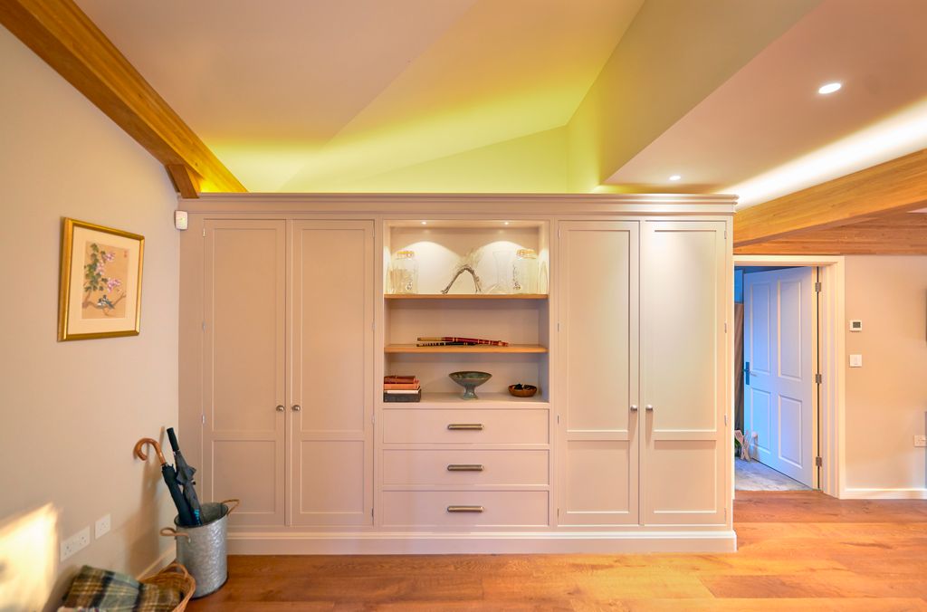 This bespoke built-in storage unit, finished in a soft, neutral tone, adds both elegance and functionality to the room. The design features classic Shaker-style doors, creating a timeless look that complements the traditional wooden beams overhead. The central open shelving offers an ideal display space for decorative items, highlighted by subtle built-in lighting that adds warmth to the room. Flanked by tall cupboards on either side, the unit provides ample hidden storage, while the lower drawers, with sleek metallic handles, offer additional organisation options. This beautifully crafted piece seamlessly integrates with the surrounding decor, balancing both form and function in a sophisticated manner.