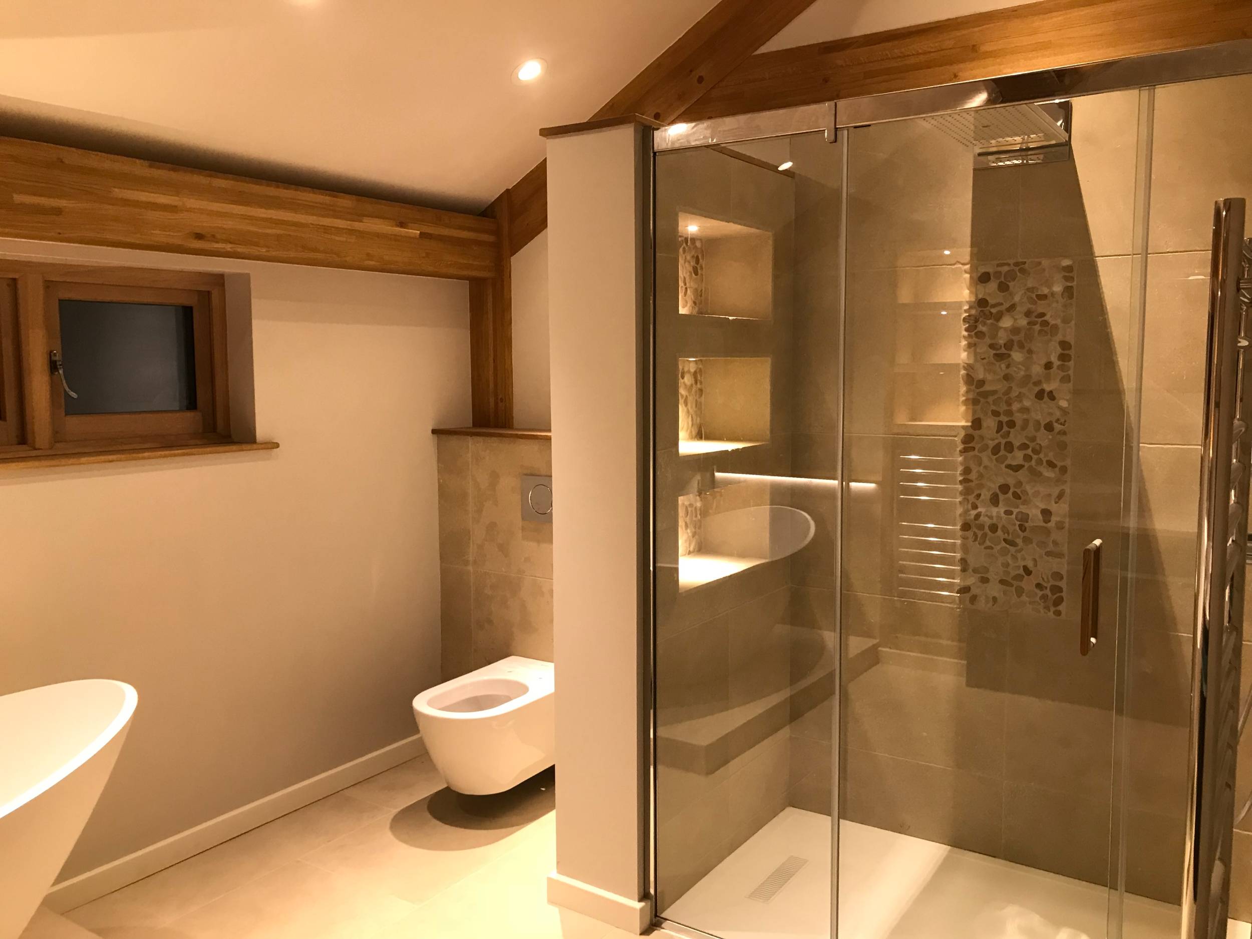 This elegant natural stone bathroom features a seamless blend of modern design and rustic charm. The walls and shower are adorned with large-format natural stone tiles, creating a warm and inviting atmosphere. A striking pebble mosaic runs vertically along the shower wall, adding texture and a touch of nature to the sleek design. The frameless glass shower enclosure lends a contemporary, open feel to the space, while built-in niches within the shower provide both storage and style. A floating toilet adds to the room’s minimalist appeal, paired with soft ambient lighting and natural wood beams that enhance the room’s rustic yet refined character. The overall design is both functional and luxurious, offering a perfect retreat for relaxation.